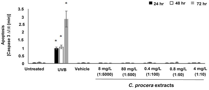 Figure 1(b) shows the impact of the different test items on Caspase-3 activation, which is indicative to apoptosis. Other than the positive control group (UVB), which significantly enhanced caspase 3 activity in all time points by 20 - 100 fold, all C. procera extracts and their vehicle detected no significant effect.