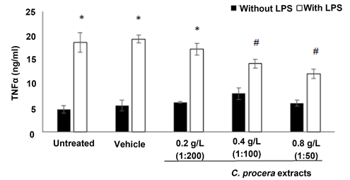 Figure 2. The impact of C. procera extract on LPS-induced inflammation. The HSOC pieces were incubated with LPS (10 μg/ml) to induce inflammation. Concomitantly, the explants were treated without or with the indicated concentrations for 48 hr. Then, TNFα (a) and IL-1β (b) levels in the spent medium were evaluated by ELISA. In addition, epidermis viability was measured by MTT assay (c). Values are expressed as means ± SEM. *p < 0.05 for differences from the control.; #p < 0.05 for differences from the LPS-treated control.