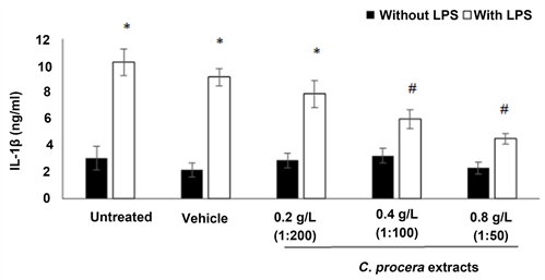 Inflammation was performed by LPS (10 μg/ml) addition to medium. Although LPS did no affect cell viability (Figure 2(a)), the results show a significant 3 fold and 4 fold induction of the inflammatory cytokines IL-1β and TNFα respectively than the control (Figure 2(b), Figure 2(c)). Treatment with C. procera extracts at concentrations of 0.4 g/L, 0.8 g/L significantly attenuated IL-β induction by 42% and 57% respectively (Figure 2(b)). These two concentrations also significantly attenuated TNFα secretion by 24% and 35% (Figure 2(c)). Unlike C. procera extracts attenuation effect, treatment with their vehicle did not attenuate cytokines secretion induced by LPS.