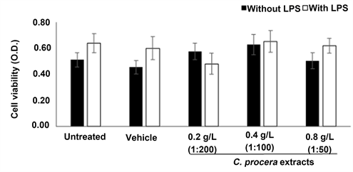 The dilutions of the C. procera extract were carried out in their original formulation, i.e., Glycerol: DDW (80%:20%) mixture. Naïve and LPS-stimulated cultures were treated without or with three non-toxic concentrations of the extracts by applying them on the epidermis topically (3 µL) 15 min prior to LPS stimulation. These concentrations were made by a serial dilution of 1:50, 1:100, 1:200. The positive control contained LPS, without addition of other agents.
