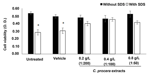 The SDS-induced skin irritation model is an experimental system allows monitoring the ability of the tested item to attenuate the deleterious impact of the SDS strong detergent of the irritant on skin surface. The hallmark of this system is the reduction of epidermis viability and the concomitant induction of specific inflammatory markers, particularly IL-1α, TNFα and PGE2 [33] [34] . As expected, the viability decreased and the levels of three measured inflammation markers were significantly increased, following SDS treatment (Figure 3). In addition, the vehicle control was not differing from the untreated control. Treatment with C. procera extract significantly abolished the decrease in epidermal viability and attenuated the elevation in all three tested biomarkers. These results indicate that C. procera extract capable to alleviate irritation symptoms.