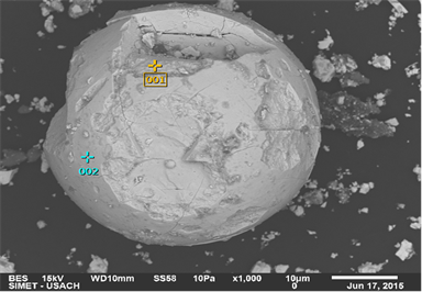 The shape of the UMo particles atomized in nitrogen and argon, inspected by Scanning Electron Microscope and EDS analysis, are shown in the micrographs of Figure 2 and Figure 3, respectively. Some irregular forms are observed, however the spherical morphology is predominant, and this is due to the superficial tension, according to the author K. H. Kim [14] , the spherical particles exhibits surface layers, apparently brittle. The high