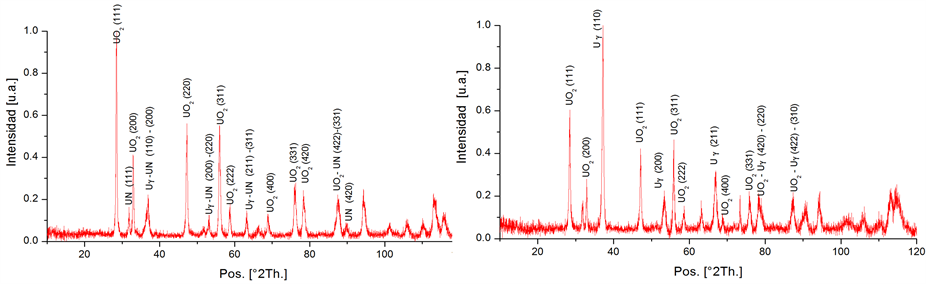 The U-7%Mo particles atomized under nitrogen and argon atmospheres was inspected analytically with X-Ray diffraction in a diffractometer (Shimadzu XRD 6000) with CuKα radiations and divergence and reception slots of 1.0˚ and 0.3˚ mm, respectively. Diffraction patterns of particles atomized in nitrogen and argon atmospheres were done, for theta angles, between 10˚ and 120˚ degrees, with steps of 0.02˚ and 1˚ second. The X-Ray diffraction patterns of atomized U-7%Mo alloy powders are shown in Figure 4.