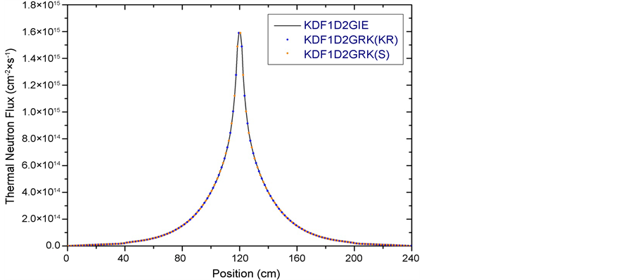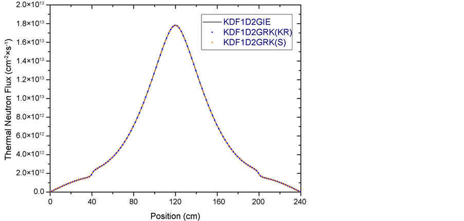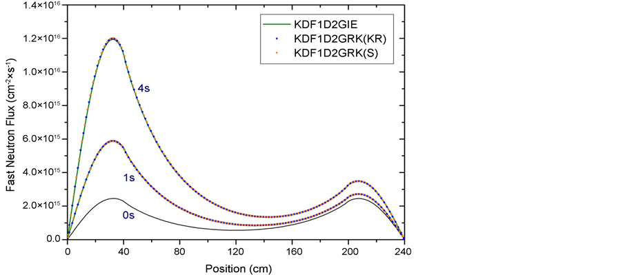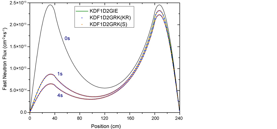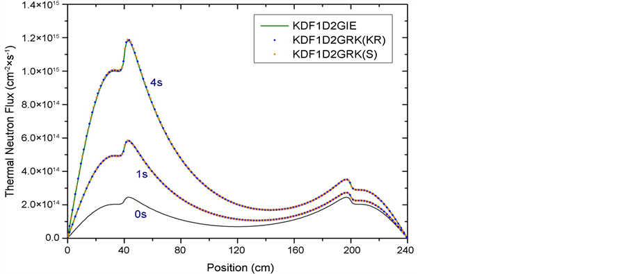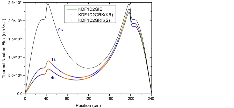 the reference solution presented in [14] . Considering the instants in 1, 2, 3 and 4 s, the highest value for the percentage relative error using the Kaps-Rentrop parameters, when compared to the implicit Euler method, was 0.163%, obtained at the instant of 4 s in the thermal flux. Using the Shampine parameters, the largest percentage relative error was 0.182%, occurring in 1s, also in the thermal flux. Regarding the processing time, Table 3 shows that the KDF1D2GIE code presented a 54.6% less time in relation to the time of the KDF1D2GRK code, with the Kaps-Rentrop parameters, and 31.7% less than the processing time with the parameters of Shampine. While this last option processed in a 33.6% lower time compared to the option with the Kaps-Rentrop parameters.