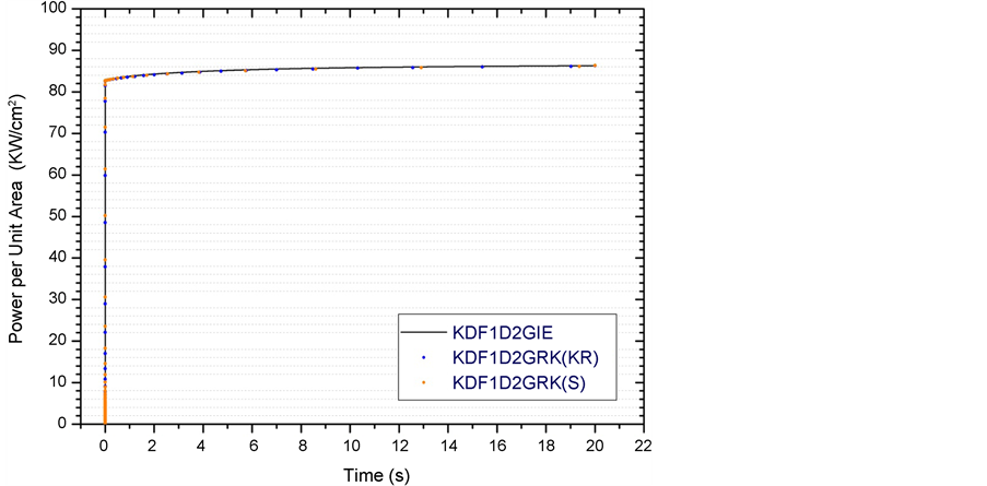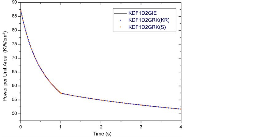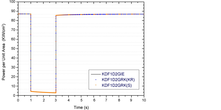 The ANL-BSS-6 benchmark presents two cases different from transients: A1 and A2. In both cases, the KDF1D2GIE and KDF1D2GRK codes were performed considering the same spatial discretization with a 1 cm mesh. In the simulation of the transient with the KDF1D2GIE code a time step size of 0.001 s was adopted, while the KDF1D2GRK code considered the two options of numerical parameters: Kaps-Rentrop (KR) and Shampine (S) and was used in Equation