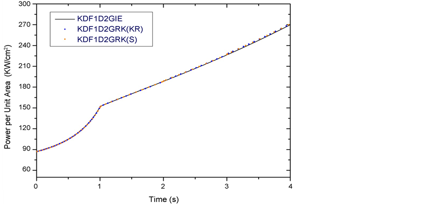 In this case the thermal absorption cross section in the first region is increased linearly in 3% up to 1 s, and maintained constant up to 4 s. Figure 2 and Figure 3 illustrate the behavior of the fast and thermal neutron fluxes at the 1 s and 4 s instants of the transient. Figure 4 shows the evolution in time of power per unit area during the simulation of 4 s. It can be seen from these graphs that the methods practically reproduce the same results and that they are in agreement with
