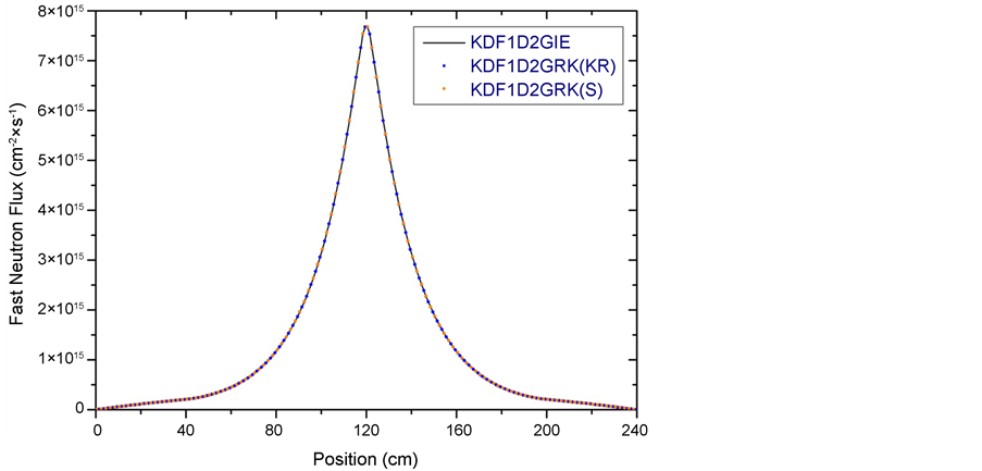 In this transient the reactor is operating critically and the proton beam of the accelerator is interrupted in the instant in 1 s and after 2 s over the beam is reconnected. Figure 12 and Figure 13 illustrate the behavior of the fast and thermal neutron fluxes at the instant in 1 s, at the beginning of the ABI, and Figure 14 and Figure 15 show the fast and thermal neutron fluxes at the instant in 3 s, at the end of the ABI. Considering the instants in 1 s and 3 s, the highest percentage relative error, when comparing the KDF1D2GIE and KDF1D2GRK codes, using the Kaps-Rentrop parameters was 0.072% in the thermal flux, occurring in 3 s, while for The Shampine parameters were 0.093% in the fast flux, occurring in 1 s. Table 4 shows that the code KDF1D2GRK with the parameters of Shampine was the fastest: 45.9% in relation to the option with Kaps-Rentrop parameters and 24.7% in relation to KDF1D2GIE.