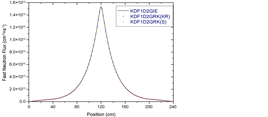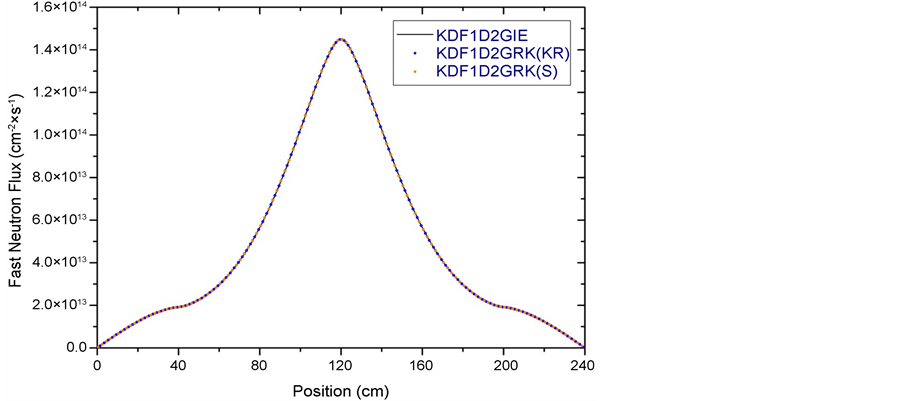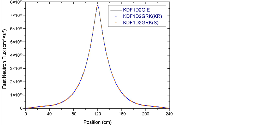 show the behavior of the fast and thermal neutron fluxes at the instant in 1 s, at the beginning of ABO, and Figure 19 and Figure 20 show the fast and thermal neutron fluxes at the instant in 3 s, at the end of ABO. Considering these instants in 1 s and 3 s, the highest percentage relative error, when comparing the KDF1D2GIE and KDF1D2GRK codes, using the Kaps-Rentrop parameters was 0.093%, in the fast flux, occurring in 1 s, while for the Shampine parameters were 0.044% in the fast and thermal fluxes, occurring in 3 s. It can be observed, as in the previous case and Table 4, that the code KDF1D2GRK with the parameters of Shampine was the fastest: 35.2% in relation to the option with the parameters of Kaps-Rentrop and 20.7% in relation to KDF1D2GIE.