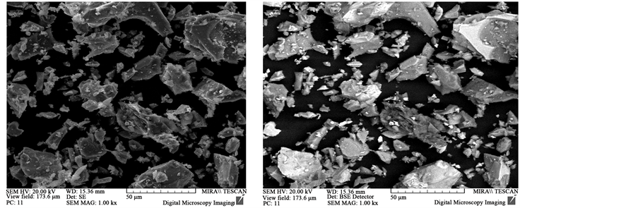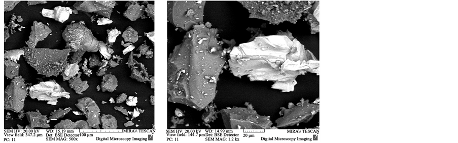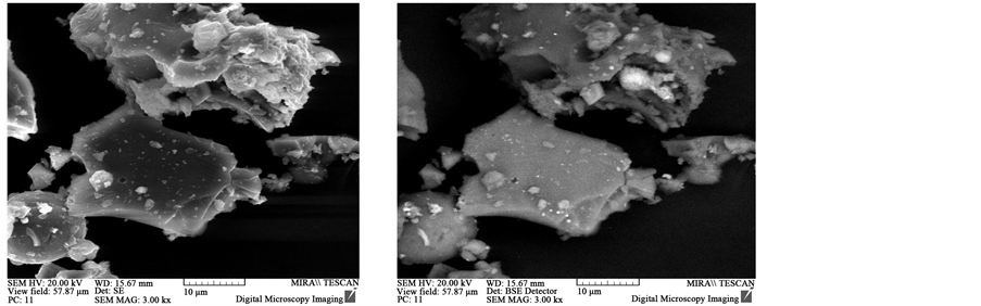 The element composition of Sample No. 5 is as follows: Si―74.7%, Fe―13.22%, Al―1.1%, Ca―1.5%. The data in the table show that by the content of iron and silicon, almost similar data are obtained in both samples. At that, in the dump slags, the content of iron and silicon in the metallic phase is relatively higher, while in the slag- lower. At comparing the roentgenograms of samples No. 1 - 4 (see Figure 2), it is seen that the phases Si [27-1402] and FeSi Ferrsilicite [35-0822] exist in all samples. The main phase of sample No. 1 is FeSi [33-0020]―40%, then come descending quantities―Si, FeSi, Al2O3, AlFe, CaTiO3, FeTiO3, FeSi2. In Sample No. 2, the main phase is FeSi Ferrsilicite [35-0822], there are also Si [27-1402], Fe [06-0696], FeSi2, SiO2, as well as products of aluminothermal reduction of the type Al8Fe2Si, Al0.7Fe3Si0.3. The phase composition of Sample No. 3 represent FeSi Ferrsilicite [35-0822] and Si [27-1402], as well as FeSi2 Ferrodisilicite [35-0822], SiO2 [14-0654], Al2O3, Al0.5Fe3Si0.5 are also present. The phase composition of Sample No. 4 represents FeSi Ferrsilicite [35-0822] and Si [27-1402], as well as FeSi2 Ferrodisilicite [35-0822], Al0.7Fe3Si0.3. The phase composition of Sample No. 5 represents Si [27-1402], FeSi Ferrsilicite [35-0822], and Ferrodisilicite [35-0822], FeSi2∙SiO2, Al3Fe2Si3.
