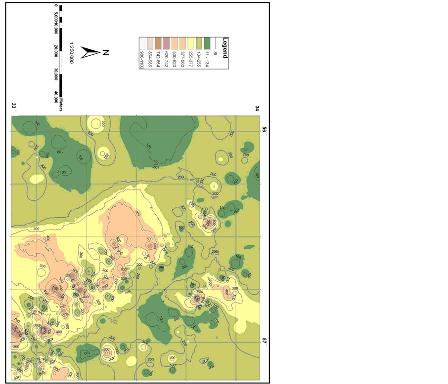 where (∆H/∆L) is local slope of the channel segment that is located between two contours and L is the channel length from the division to the midpoint of the channel reaches for which the index is calculated. This index is calculated along the master river (Table 1) and then SL contour map is prepared (Figure 4). The SL index can be used to evaluate relative tectonic activity. An area on soft rocks with high SL values can be indicated for active tectonics. Based on [11] , SL value is classified into 3 categories, which are: class 1 (SL > 500), class 2 (300 < SL < 500), and class 3 (SL < 300). The more values of SL is greater than 300, thus there are in 2 and 3 classes.