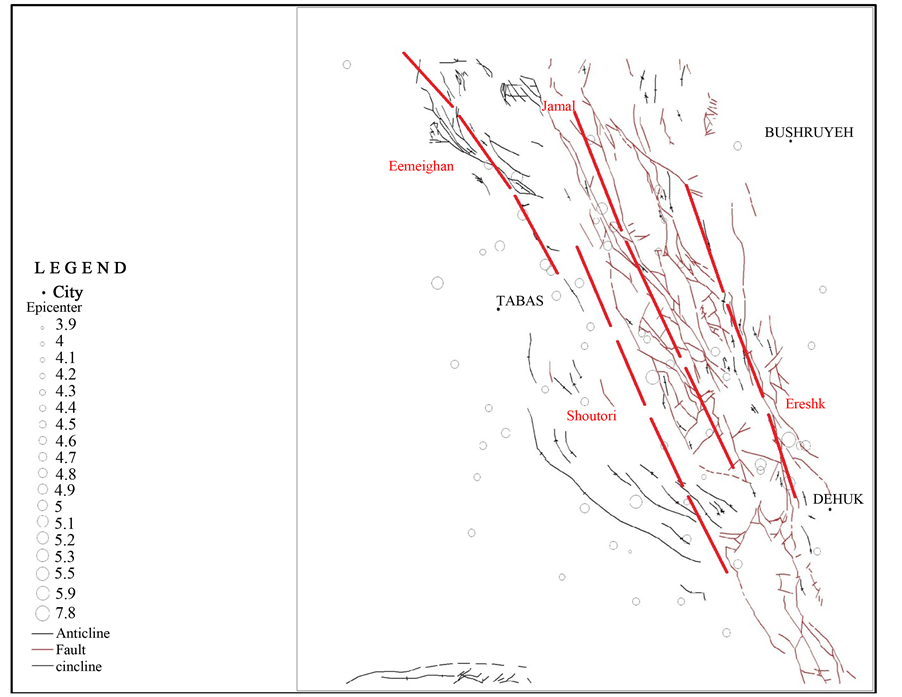 The study area is the north part of Tabas area [1] in the east-central Iran basin [2] . Dominant structural trend in east-central Iran province is N-S (Figure 1). From tectonics view, it contains an ancient island arc on the west of the Lut Plain-Gonabad province that has accreted to this along Nayband fault system (western border of the Lut microcontinent) by eastward subduction in Pre-Cambrian [3] .