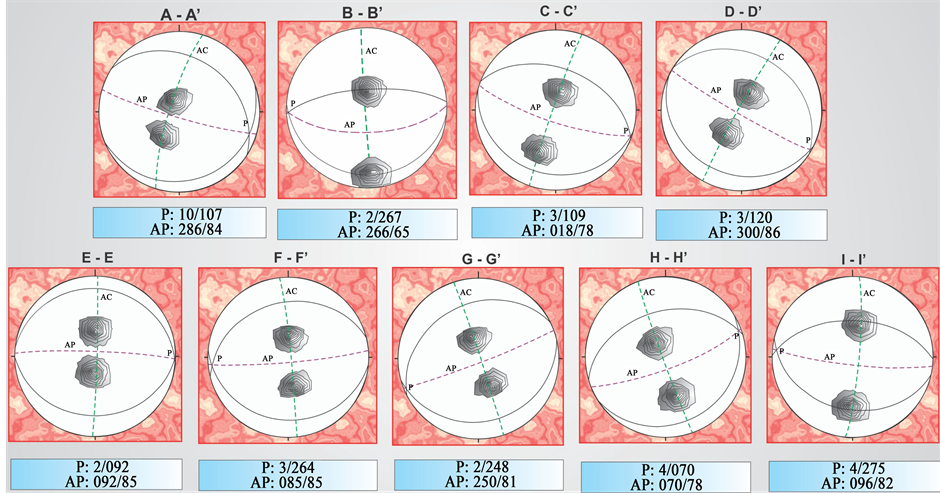 Based on [7] for description of fold, seven stereoplots (output of Tectonics FP software) were prepared for seven parts of the Gavbast anticline. According to results, these stereoplots show the location of axial plane (AP) and cylindricity (AC) and Plunge of Fold (P) (Figure 4). This part to be done based on seven structural cross sections of the Gavbast anticline. The locations of these structural cross sections (from A-A’ to G-G’) is shown in Figure 3, Figure 4.
