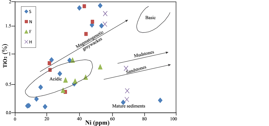Figure 8. TiO2 versus Ni bivariate plot for the Kazhdumi sandstones (fields after Floyd et al., [47] ). Majority of the samples plot near the acidic source field.