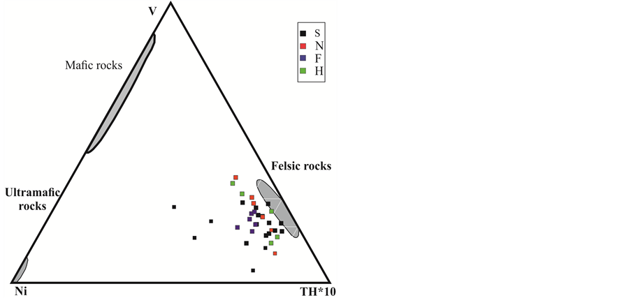Figure 10. V-Ni-Th*10 triangle diagram (after Bracciali et al., [49] ). Shaded area represents composition of the felsic, mafic, and ultramafic rocks. The Kazhdumi sandstones plot near felsic source rocks. Loose sand samples with high Ni content are shifting toward the Ni corner.