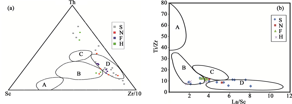 The goal of provenance studies is to deduce the characteristics of sediment source areas. The various types of source rocks produce different suite of detrital minerals which reveal the character of that rock from which the suites have originated [1] . However, the geochemical composition of clastic rocks is widely used to understand the composition [2] - [5] , evaluate weathering processes [6] - [8] , and to develop paleogeographic reconstructions of source regions [9] - [11] . Trace elements (e.g., Nb, Ni, V, Co, Y, La, Th, Sc and Zr) in clastic sedimentary rocks are considered to be immobile under conditions of weathering, diagenesis and moderate levels of metamorphism, and are commonly preserved in sedimentary rocks [12] [13] . Therefore, such trace elements might constitute well-established provenance and tectonic setting indicators [12] [14] .