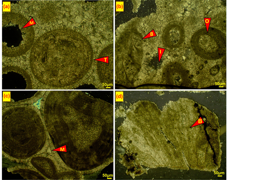 Figure 4. Shoal Facies: (a) and (b) Bioclast ooid grainstone, Tangential ooids “T” with oomoldic “O” and intergranular “I” porosity accompanied with bryozoans “B”; (c) Ooid grainstone with isopachous rimmed cement “M”; (d) Coarse grain intraclast bioclast grainstone including whole bryozoans “B” (XPL).