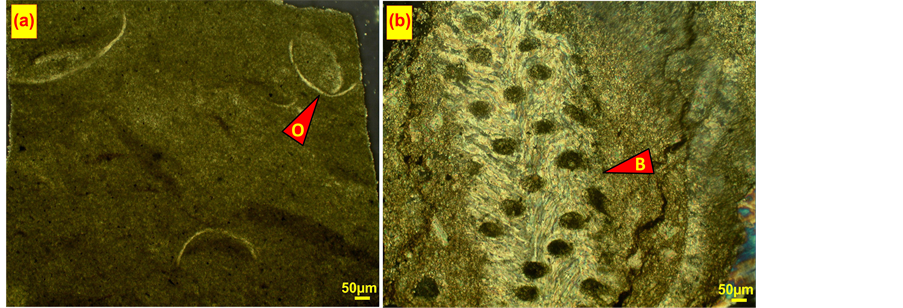 Figure 5. Open Marine Facies: (a) and (b) Bioclast mudstone, ostracods “O” and punctate brachiopod “B” fragments are outspread in the matrix (XPL).