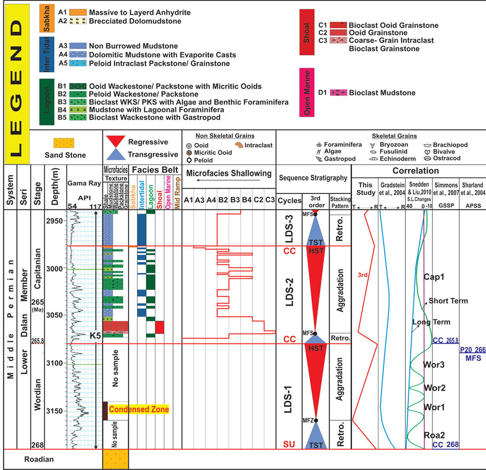 Cycle 1 (LDS-1): This cycle has been identified according to the electrical logs (Gamma-Ray) and Paleologs due to lack of samples (Figure 7). The Maximum Flooding Surface (MFS) of this unit is marked by argillaceous and shaly deposits comprising “condensed zone” (Picked by sudden increase in gamma-ray response). The lower boundary of this cycle coincides the Global Stratotype Section and Point (GSSP, CC 268 Ma) [12] and sea-level falling [8] [11] . The MFS of this cycle is according to Wor1 [8] and sea-level rising [11] . The upper boundary of this cycle would correspond to the GSSP (CC 265.8) [12] and sea-level falling [8] [11] .