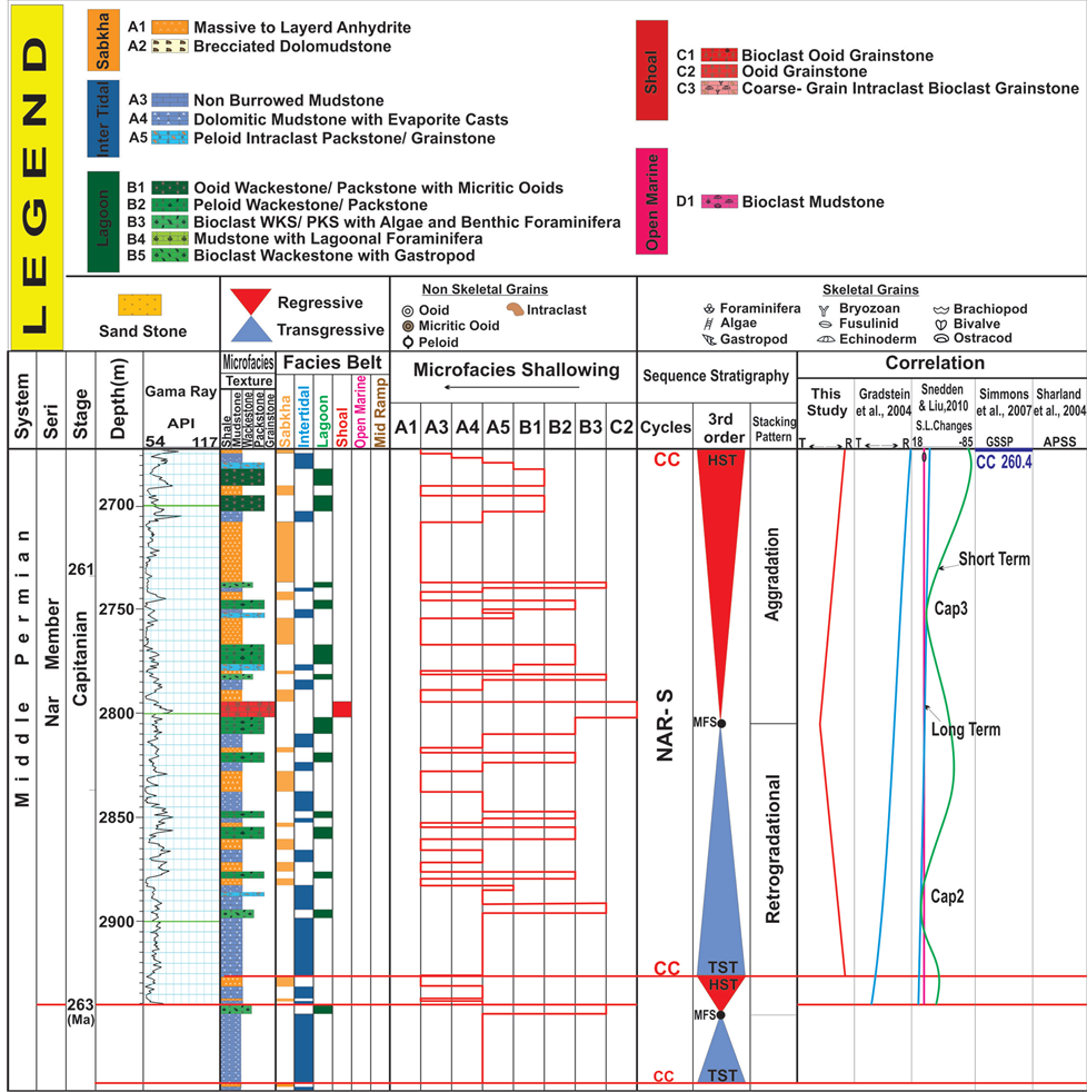 Cycle 4 (Nar-S): This sequence includes Nar member (Figure 8). TST includes a succession of intertidal and lagoonal facies in retrogradation stacking pattern. The maximum accommodation of this unit is distinguished by ooid grainstone facies (C2). The MFS of this cycle is according to the Cap3 [8] . This cycle is characterized by global warming and sea-level falling evidenced by intertidal to supratidal evaporitic facies.