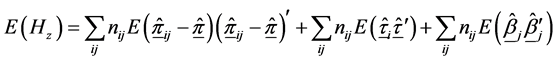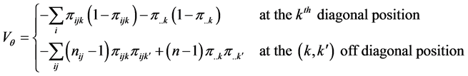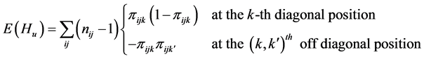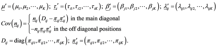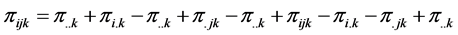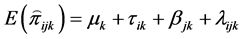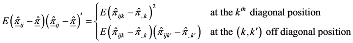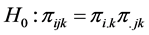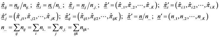 The 3-way contingency table under the multinomial structure described above is similar to the layout of a three-factorial experiment with one observation per cell. In the spirit of [7] and drawing an analogy from the factorial experimental structure, a linear additive model for the observed cell probability in the
