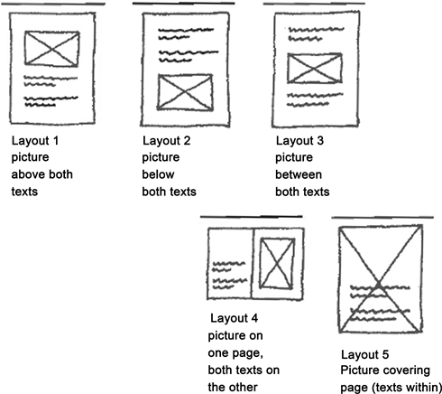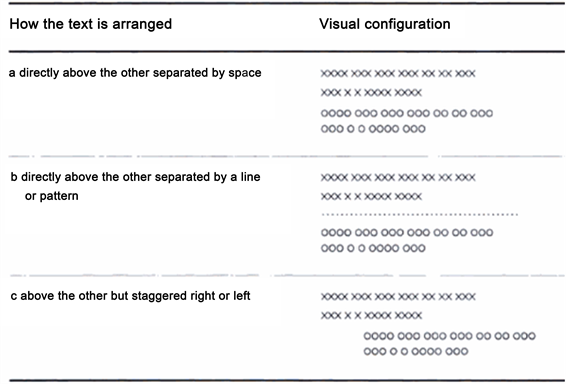 exist between the pictures and the words. This is mainly due to the fact that it does not just highlight a text/picture relationship, but a text/text/picture that needs to be configured. This results in the availability of different organization techniques. The most common way of the arrangement includes one text to be placed over the other in one of the three ways as shown in the image below (Figure 2).