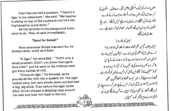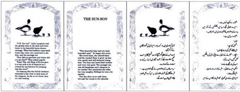 languages such as the usage of Latin as well as non-Latin alphabets. The analysis has demonstrated that the typographic treatment given to both the languages and also their placement on a single page can facilitate readers’ understanding of both languages. The main factors affecting the typographic status have been found to be mode (typeset, handwritten or word processes text), size, amount of text and use of space. Ideally, in a dual text book, how each of these factors is dealt with can play a positive role in ensuring that both the languages are viewed as equally important (Ntelioglou, Fannin, Montanera, & Cummins, 2015: p. 70). According to Walker, Edwards and Blacksell (1996), directionality is a design issue in dual texts when right-left reading languages are combined with left-right reading ones. They believe that most dual texts incorporating right-left reading languages tend to be produced within the book conventions of left-right languages. Readers of the Urdu part of a dual text, thus, need to open the book from the ‘wrong’ end. Some arrangements of text, however, allow for successful incorporation of right-left reading languages (Figure 5).