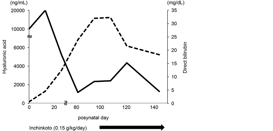 Considering its reported efficacy on liver fibrosis in children with postoperative biliary atresia [6] [7] , the Japanese herbal medicine, Inchinkoto (Tsumura & Co., Tokyo, Japan) was orally administered at the dose of 0.15 g/kg∙per∙day) since PD 100. In parallel with the commencement of Inchinkoto, both D-bil and HA gradually decreased to 18.3 mg/dL and 1280 ng/mL, respectively on PD 144 (Figure 1). Improved jaundice made him possible to discharge on PD 144. Unfortunately, however, he developed fatal DIC and multiple organ failure