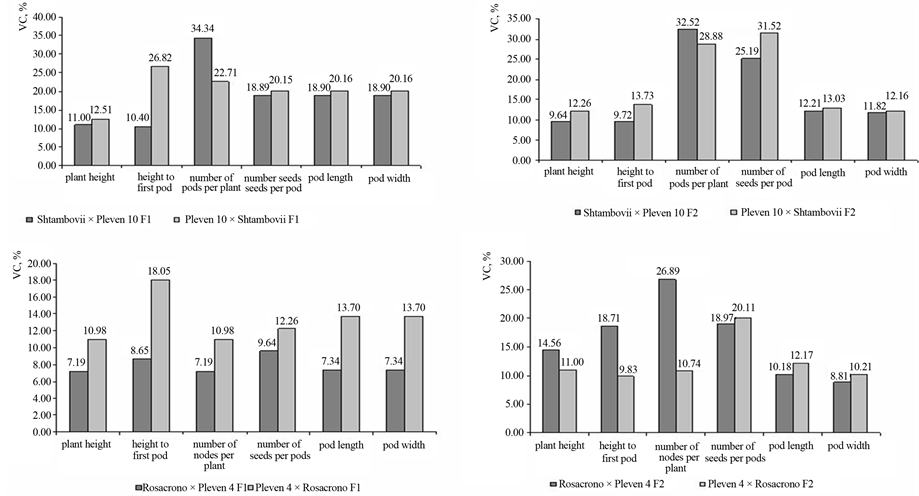 The variation was considered low, if VC was 10%, medium, if VC was between 10% and 20%, and high, if VC was higher than 20%, respectively. The CV values varied in a different way depending on crosses and traits. The level of variability of the traits in F1 in hybrids between Shtambovii and Pleven 10 was higher (from 10.40% for height to first pod to 34.34% for number nods per plant) than F1 of the other hybrid combination (from 7.19% for plant height to 18.05% for height to first pod). At direct crosses the variability was lower in relation with re- ciprocals and in both hybrids combinations with exception for nods per plant in Pleven 10 × Shtambovii. In the second generation F2 highest range of the variability was established for nods per plant and number seeds per pod in all hybrids exception Pleven 4 × Rosacrono (10.74%). Positive values of the coefficients for effectiveness of selection were established for height plant (0.25) at Rosacrono × Pleven 4, height to first pod at Shtambovii × Pleven 10 and reciprocal (0.09; 0.32), pod length at Pleven 4 × Rosacrono (0.23), number seeds per pod at Shtambovii × Pleven 10 (0.24) and Pleven 4 × Rosacrono (0.18) and for pod width at all hybrids with exception of Pleven 4 × Rosacrono.
