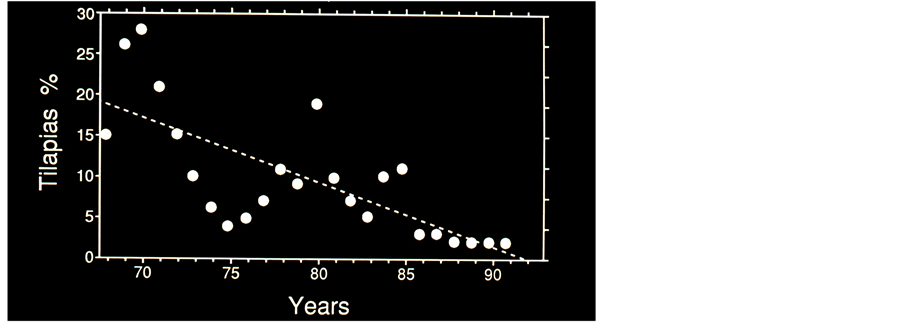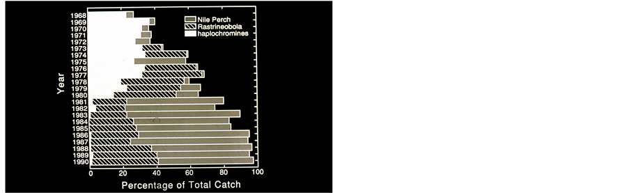 fish faunal composition was modified from the dominant native Haplochromines which were replaced by the exotic Nile Perch and native Rastrineobobla [22] . Lake Victoria is presently exhibit traditional symptoms of eutrophication: decline of water transparency, Cyanobacteria are dominant, elevation of P and decline of N levels, increase of algal biomass (chlorophyll concentration), shallower Secchi depth and thinner euphotic zone and anoxia enhancement. Future management design of fishery in lake Victoria must therefore be done very carefully. Distinct objectives are proposed: 1) reduction of pollutant inputs resulted by anthropogenic activity; 2) increase level of phytoplankton grazing. The second target is difficult due to the intensive predation pressure produced by the Nile Perch. Relevant fish species might be planktivorous large body Tilapias. Tilapias of native and exotic origin are known to be able to survive under the new habitat if may introduce to the lake as large un-preyed individuals. The concept of the Nile Perch predation impact and its ecological implications is also confirmed by the elimination of the Haplochromines’s planktivory (Table 4). Nevertheless, the small body size of the Haplochromine fishes make them vulnerable for predation and therefore not suitable for management if aimed at enhancement of planktivory. Large body size of the planktivorous Tilapias are less vulnerable to Nile Perch predation. Index Of Satiation calculated for Tilapias species collected from the natural lake population indicated high values (Table 6) in comparison with the range of 0.5 - 4.0 that was obtained from farm cultured fish given an optimally food quantity [23] . Consequently I assume that the planktivorous capabilities of Tilapias might be beneficial for ecological recovery of Lake Victoria.