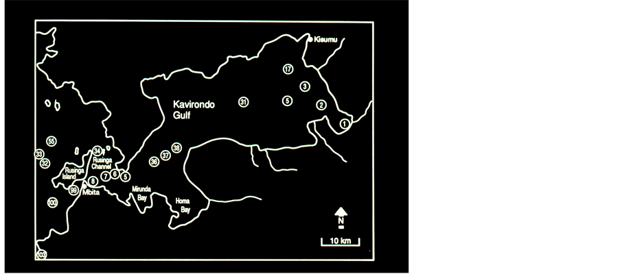 Figure 2. The Kenyan Part of Lake Victoria Kavirondo, (Wynam) Gulf Sampling Stations are numbered.