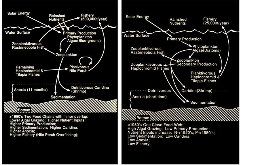 Figure 3. Food-Web structure scheme in Lake Victoria: After 1980 (left) and before 1980 (right) (by courtesy of S.L. Kaufman).