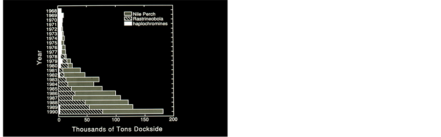 After 1980 (Figure 3): Food web structure exhibit disequilibrium. Grazing level decline due to elimination of grazer Haplochromines and dominance of the predator Nile Perch; Therefore, Increase of non-grazed algal biomass (chlorophyll elevation) followed by higher Primary Production accompanied by accumulation of surplus organic matter and sedimentation resulted in enhanced anoxia. Secchi depth and the thickness of the euphotic zone became shallower as a result of higher densities of suspended matter and decline of light penetration [19] - [21] . Decline of available Silica and SRP (Soluble Reactive Phosphorus), and the decline of TN/TP mass ratio were probably the reason for the replacement of Diatom before 1980 by Cyanobacteria dominance after 1980 (Table 8). Another outcome of those changes was the proliferation of the detritivorous Atyid-Decapod Caridina nilotica. The total annual landings were significantly enhanced as a result of the optimal conditions for the reproduction and growth of the Nile Perch. The ecological structure modification summarized here gave scientists and managers the basis for further programming fisheries activity. Recent information does not confirm significant improvement in comparison with data presented in this paper.