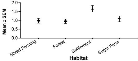 Human settlement had the highest mean with a density of 1.664 ± 0.18 birds/Ha. Then it was followed by sugarcane farms with a density of 1.092 ± 0.16 birds/Ha. Nyangweta secondary forest came third with a mean density of 0.9819 ± 0.13 birds/Ha. Mixed farms had the lowest density/Ha of 0.95 ± 0.17 birds/Ha (Figure 2).