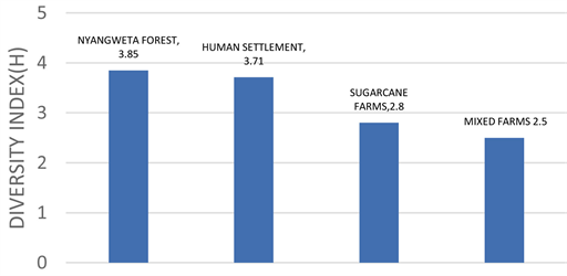 In the four habitats, H range was between 2.5 and 3.85. Shannon diversity index was higher in secondary forest (H = 3.85) than in other study sites. Secondary forest was diverse with more different and number of bird species compared to other habitats. A further post hoc Turkey’s pairwise comparison test showed that the Nyangweta secondary forest had the highest diversity with a diversity index of 3.85, Human settlement followed with a diversity index of 3.71. Sugarcane plantation and mixed farming were third and fourth with an index of 2.8 and 2.5 respectively. As shown in Figure 5.