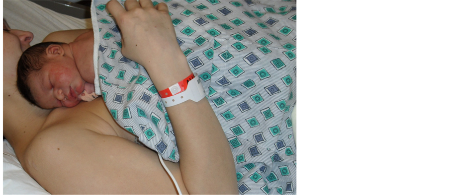 4. Place the newborn skin-to-skin, upright, and chest-to chest with the mother (Figure 1).