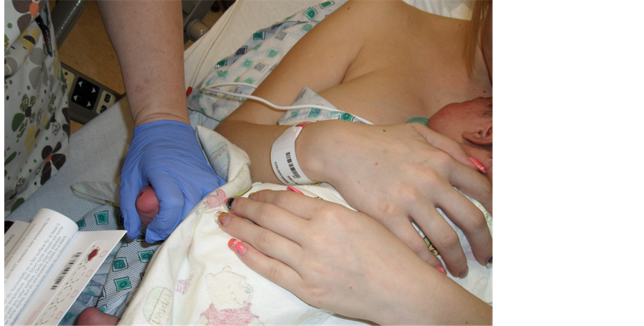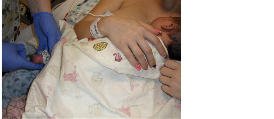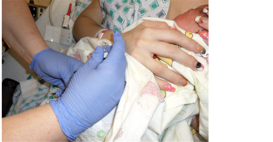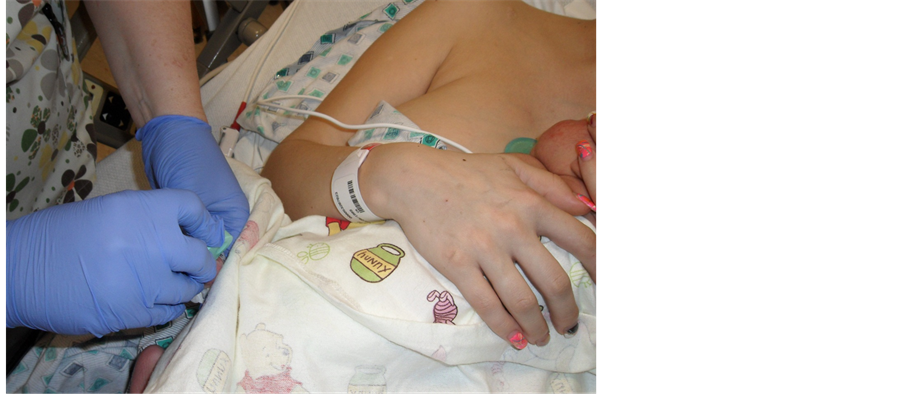 The American Academy of Pediatrics [1] [2] and the Canadian Pediatric Society [3] have recommended that skin-to-skin contact (SSC) be used to minimize procedural pain in full term and preterm newborns. Amelioration of neonatal pain is needed to prevent the short- and long-term adverse effects of untreated repeated pain in the neonatal period [4] [5] [6] . Repeated unrelieved procedural pain is related to life threatening physiological [7] [8] and behavioral outcomes [9] , including long-term heightened pain or hyperalgesia [10] [11] , and increased stress sensitivity [12] . Sources of repeated pain in the neonatal period are the invasive procedures needed to obtain bilirubin and glucose samples, testing blood for phenylketonuria, and administration of Vitamin K and Hepatitis B injections prior to discharge in healthy full term newborns. SSC has been confirmed as an effective non-pharmacologic pain reduction intervention when provided by the mother or father [13] [14] , and when given alone [15] [16] [17] or in combination with breastfeeding [18] , sucrose [19] , and rocking [20] . SSC relieves pain from heel-stick [21] [22] [23] , injection [15] [16] [24] , or venipunc- ture [25] . A Cochrane analysis of randomized trials of SSC’s pain reduction effects in preterm newborns showed that it is highly effective in reducing the pain associated with painful procedures [26] . Though these numerous studies have been conducted, many nurses still do not practice SSC to reduce pain in clinical settings [27] [28] [29] [30] . Reasons for the under-utilization of SSC are unfamiliarity with using this non-pharmacological intervention to reduce procedural pain [30] and anticipated discomfort by nurses and phlebotomists when conducting heel sticks and injections during SSC [28] .