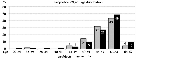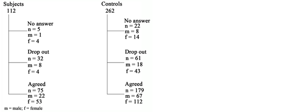 The individuals who refused to participate to this study had the same education level, age and sex distribution as the participating individuals. One male subject could not be contacted after initial inclusion in the study, and one female subject dropped out of the study before the psychological test was administered. 37 individuals refused to participate (9 males and 28 females) in the study. The mean ages of the male and female participants who refused to participate in the study group were 59 years (standard deviation (SD), 3.61) and 61 years (SD, 4.46) years, respectively. A total of 31 participants had a primary school level of education, and 34 had no vocational education. More matched controls than subjects refused to participate in this study. The complete information for the participants of this study is in the Table 1 [2] .