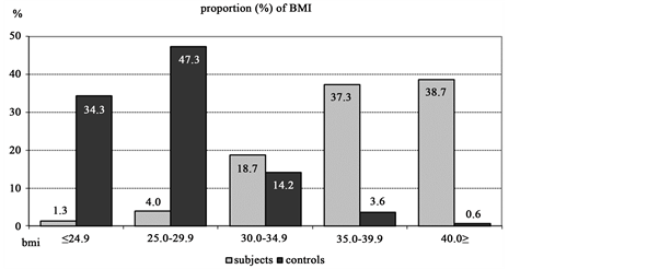 Body mass index (BMI) was calculated as weight (kg) divided by height (m2). According to the WHO guidelines, the weight categories were defined as follows: overweight, BMI 25 ≤ 29; obese, BMI 30 ≤ 34; severely obese, BMI 35 ≤ 40; and morbidly obese, BMI > 40 kg/m2 [1] . Figure 3 shows the body mass index distribution in this study.