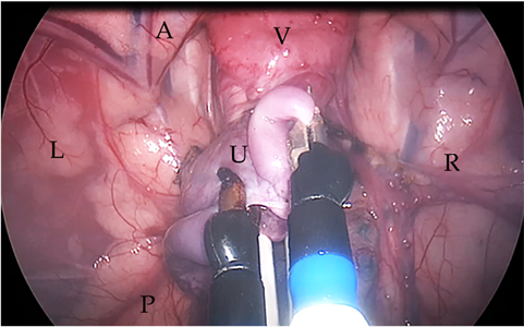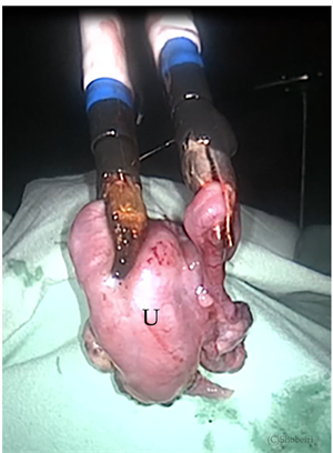 The robotic arms were retroflexed in position to perform a supracervical hysterectomy following the conventional steps of laparoscopic hysterectomy: The infundibulopelvic ligament was coagulated and cut (Figure 10) with the use of the energy source of the robotic arms; the round ligament and the remainder of the broad and cardinal ligaments were divided (Figure 11); the vesicouterine peritoneum was dissected off the anterior portion of the uterus, and the uterine arteries were skeletonized. At this point, the ascending branch of the uterine artery was identified, cauterized, and divided. The cervix was then amputated from the corpus at a point just below the internal cervical os and superior to the uterosacral ligaments (Figure 12). The robotic arms were straightened, and the uterine corpus was extracted via the vaginal entry point in the pouch of Douglas, with no need for morcellation (Figure 13). The vaginal cup was closed with continuous sutures. On average 20cc of blood loss was reported, no complications were observed, and no technical difficulties were encountered during surgery.