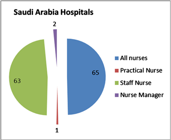Figure 1 and Figure 2: The two figures show that distribution of nurses regarding hospital types, mostly sample were practical nurse (59%) from Palestinian while 63% were staff nurse from Saudi Arabia Hospital.