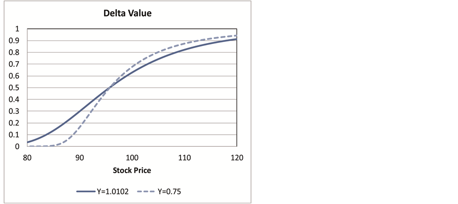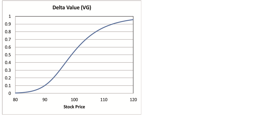 Figure 2 shows the price and delta values of a European call under the CGMY model for different values of Y using Treecode 2. Here, Y = 0.75 indicates that the process has finite variance and therefore the prices are lower than the case of Y = 1.0102, whose process has infinite variance. Figure 3 shows the price and delta values of a European call under the CGMY model with Y = 0.0 (therefore this model corresponds to a VG model) using Treecode 2, where the following parameter settings [26] were used: r = 0.00, q = 0.0, C = 5.9311, G = 20.2648, M = 39.784, Y = 0.00, and T = 0.5. Both figures demonstrate the smoothness of price and delta with respect to stock price.