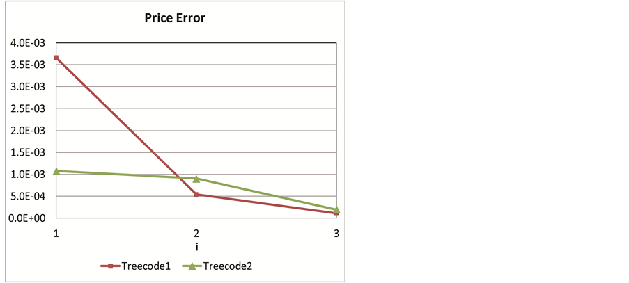 For Treecode 2, because is a smooth curve with respect to , it suffices to only compute one-eighth the number of grid points equally distributed and interpolating the other grid points via a spline scheme for evaluation of . As shown in Figure 1, we can achieve similar price errors in the case of Treecode 2, while reducing computational time. This method would be especially useful for path-dependent option pricing and a detailed investigation is left for future research.