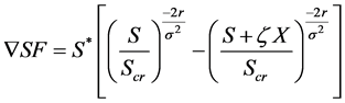 where because the Arrow-Debreu security is exercised when the safety social ratio equates 1, and, thus. Equation expresses the proportion of the present value of the failure costs on its maximum value as a function of the proportion of the CSR capital on its minimum or critical value, i.e. the social risk ratio, , as a function of the safety social ratio,. The greater the social capital with respect to its critical value, the greater the safety social ratio and, thus, the lower the social risk ratio. About the latter, we can say that, the lower the better. It is straightforward to show that the derivative of with respect to is negative