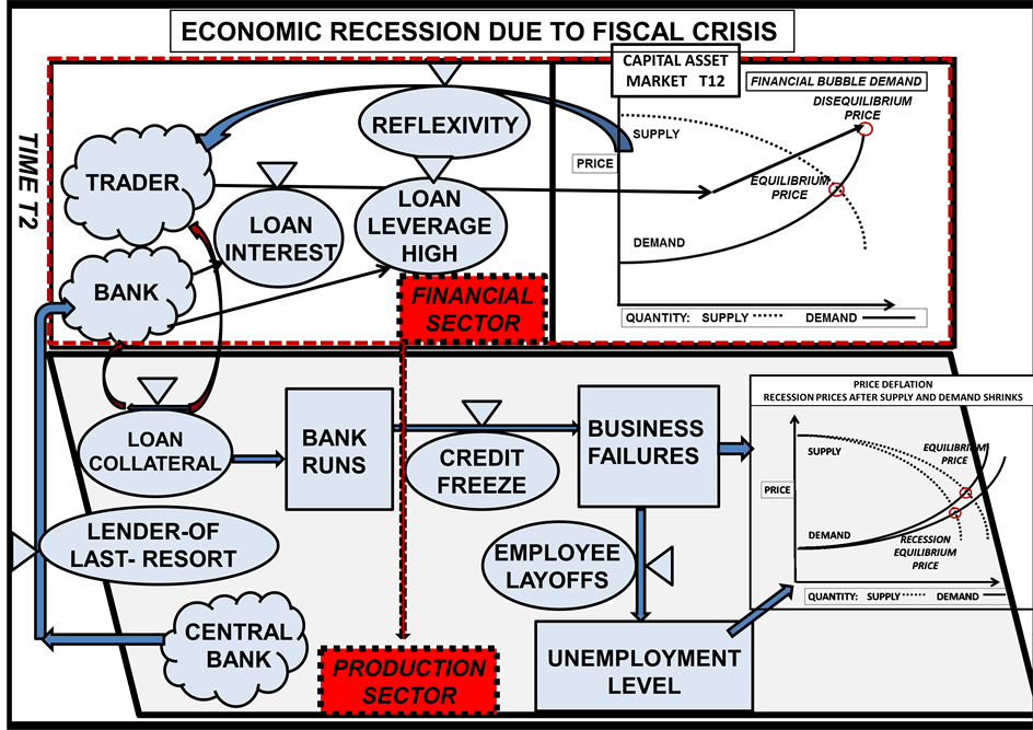 The reason for topological separation of the models commodity and financial markets is that their dynamics are quite different: price equilibrium in commodity markets but price disequilibrium in financial markets. And a fiscal crisis in the financial system triggers an economic recession in the production plane. This occurs as bank failures stop the credit system of a nation; and business declines with unemployment rising. Banks provide the daily accounts and credit lines upon which businesses operate―manufacturing, services, and retail businesses. When bank accounts are frozen, the monetary system (currency and credit) stops and the economy seizes up. Businesses need daily credit lines with banks to operate on a daily schedule. Thus the monetary system is one of the societal sub-systems (in addition to energy sub-systems) which need to operate on a daily (and even hourly) basis for a modern economy to run continuously.