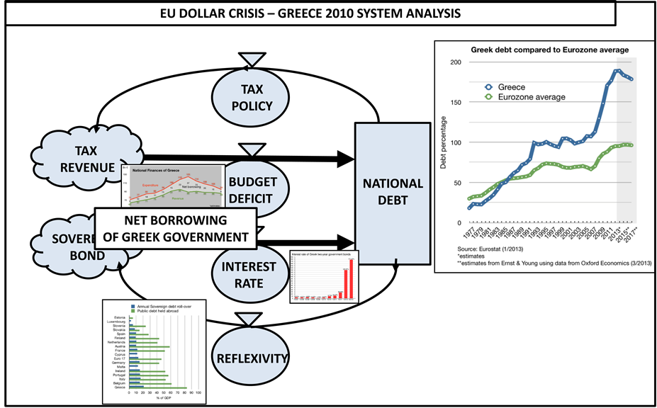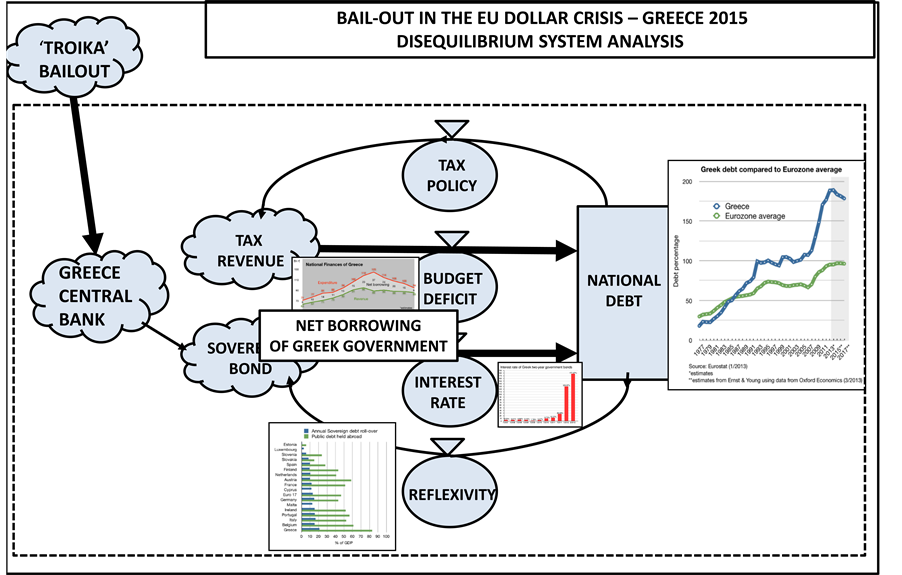 sources and bond sources) and stock (e.g. national debt) of the system. Such flows are determined by the institutional structure of the system, adjusted by the structural rate controls (e.g. budget deficit, interest rate, reflexivity, tax policy). If the institutional structure does not alter, then a systems dynamics model is a “stasis” model (constant flow model). Thus the dimension of time did not appear explicitly in this disequilibrium system model of Greek fiscal policy, because there were no structural changes to the Greek system over the period of time leading to the fiscal crisis in 2010. But then ‘market reflexivity’ (perceptions by bond traders on the likelihood of a Greek debt default) changed! Then bond traders would no longer purchase Greek sovereign bonds at reasonable interest rates. The market would no longer buy them, and interest rates on new Greek bonds jumped―a “Minsky moment”. At the time of the fiscal crisis in 2009, the reflexivity in the bond market jumped the acceptable interest rates on new Greek bonds to bubble heights, as market doubt began about the financial stability of the Greek government―a structural change in the market, due to market reflexivity.