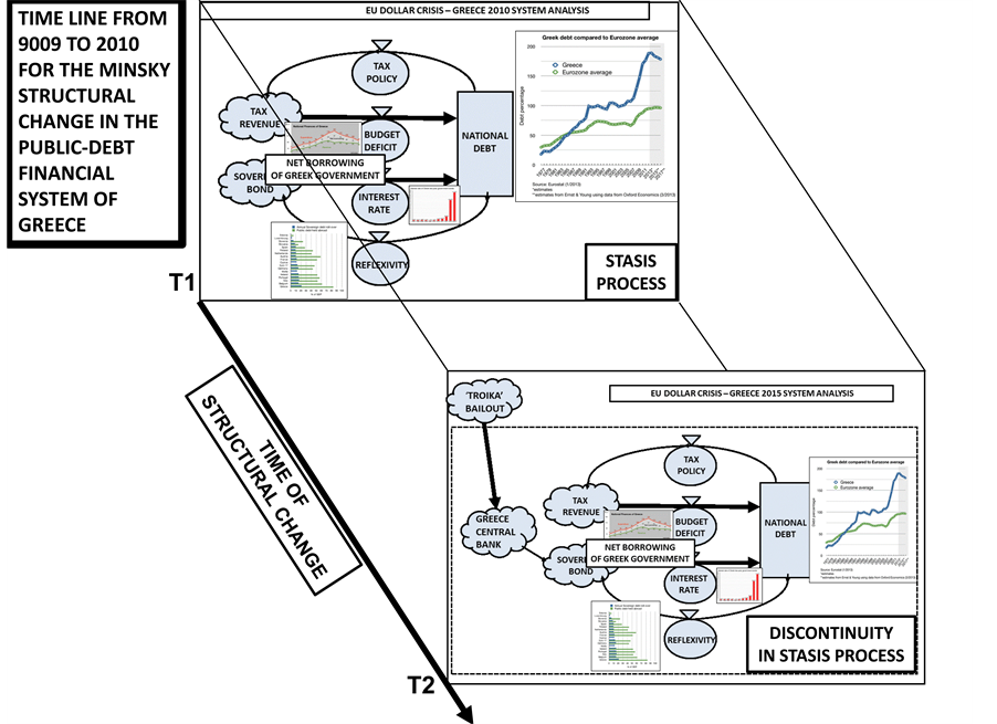 This describes a structurally-time-changed-disequilibrium systems model of a governmental fiscal system (public debt). There are two kinds of time lines in a Minsky systems dynamics model of a price-disequilibrium of a financial market. Within the systems dynamics model, the financial processes are in a stasis mode (recurrent mode), with valves (such as tax policy, budget deficit, interest rate, reflexivity) controlling the steady-state flow of finances from sources (tax revenue and sovereign bonds to a financial stock (national debt). But a second kind of time occurs when a bubble builds in the market (from T1 to T2) resulting in a “structural change” in the market system, collapse of the bubble and external banking intervention (Euro Troika) to bail-out the collapsed market.