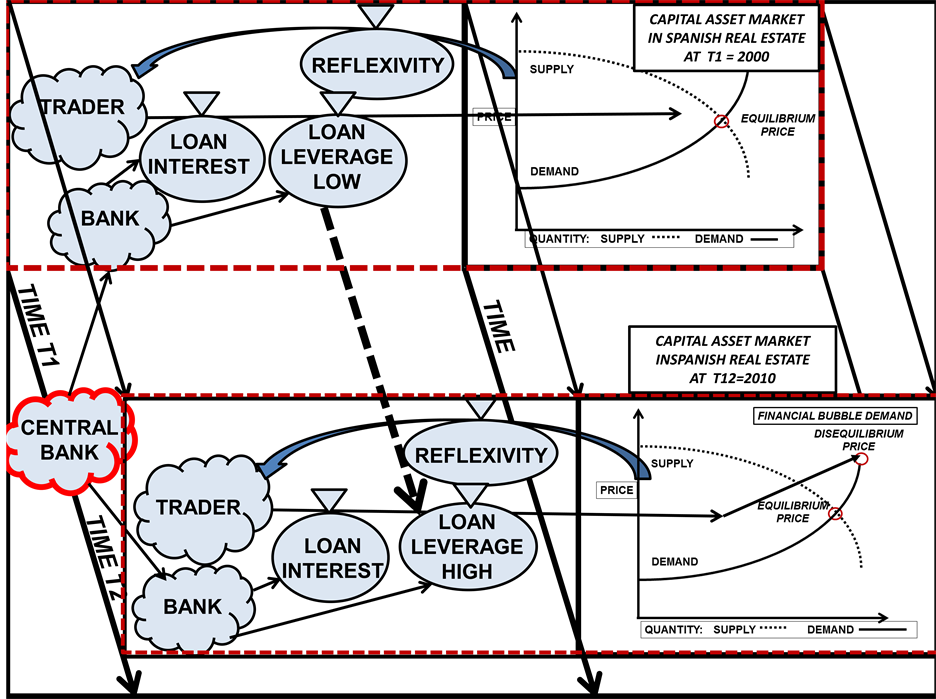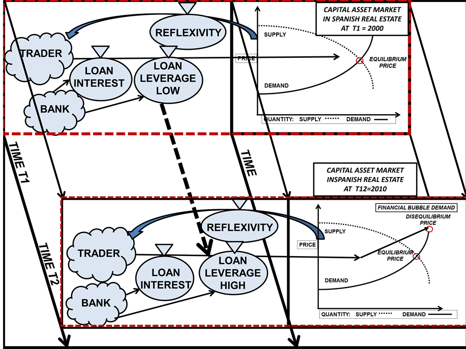 In this temporal model, a Trader obtains a Loan from a Bank with Leverage to purchase a capital asset in a Market in the time period T1. Rates on Interest and also Leverage are both necessary for the Trader to optimize profits, when the trader resells its Capital Asset purchase at the future time. The capital-asset market was in price equilibrium when traders begen speculation in the market, with the reflexive expectation that prices in the market would rose above equilibrium price. Later in the time period T2, bank financing of trader loans changed the market financing from a state of “Speculative” to that of “Ponzi” and then the global financial market collapsed in 2008. The “Minsky moment” occurred when the real estate bubble in Spain “burst” and the Spanish banks financing the real estate loans suddenly became “insolvent”.