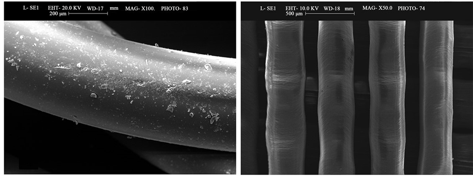 Figure 6 shows the secondary electron images for strands of the rosin only compared with the equivalent strand based on rosin with nanoclay 30% (w/w). The rosin strands are smooth and regular with a width of ~400 μm. The nanocomposite based strands of the composite show a small regular variation of ~5% in thickness of the strands. Other than that slight variation, the scaffold is well defined with strand spacing which defines the porosity.