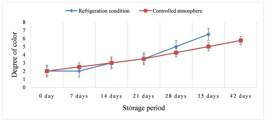 Weight loss during storage is directly related to storage temperature and period. It is resulted because of moisture loss through transpiration. However, weight loss of fresh tomato during storage period was found almost linear under both of storage conditions (Figure 6). The rate of weight loss was higher in controlled atmosphere during first week of storage period than refrigeration condition. From second week of storage period, weight loss was observed to be faster in refrigeration condition compared to controlled atmosphere. At the end of 35 days of storage, tomato stored in refrigeration experienced 12.81% weight loss, whereas weight loss of 9.74% was recorded in controlled atmosphere. In addition, weight loss of 12.8% was observed in controlled atmosphere after 42 days of storage study. According to Znidarcic et al. [19] , weight loss of 18.7% was observed in tomatoes stored in 10˚C for 28 days.