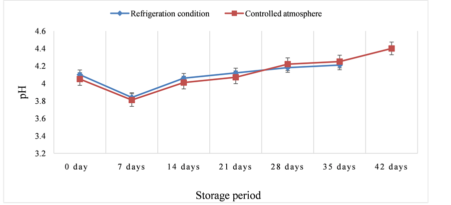 stored tomatoes under both of conditions was not observed during the 35 days of storage study. However, pH increased at a higher rate in stored tomatoes under controlled atmosphere during the last week of storage study. This result was in line with the findings of Castro et al. [20] who reported that pH increased with the increase of degree of maturity.
